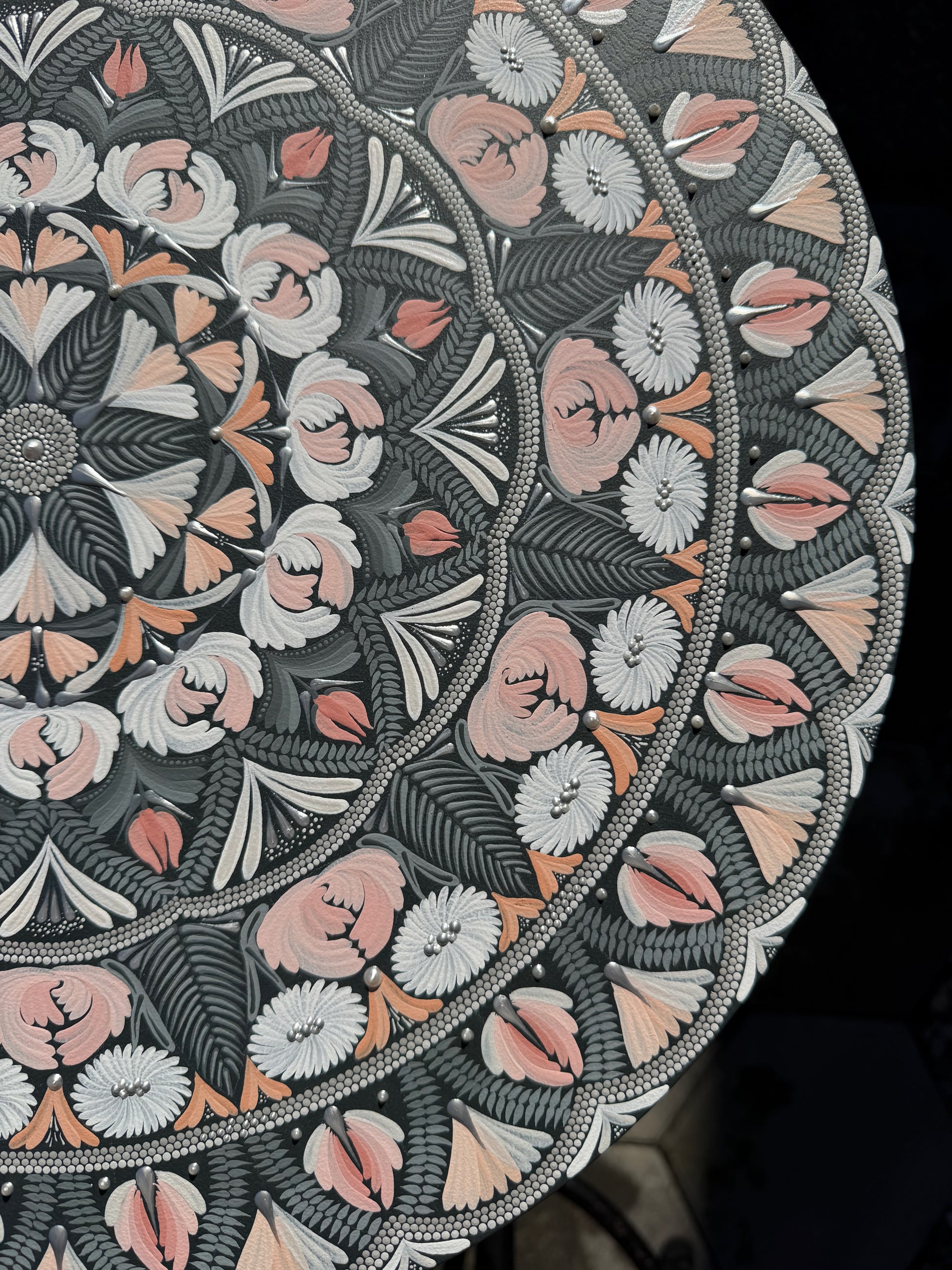 Each mandala is created by hand in my studio with intention, patience, and precision. Every piece begins as a blank MDF round and transforms through layers of acrylic paint, intricate patterning, and luminous accents that catch the light from every angle.